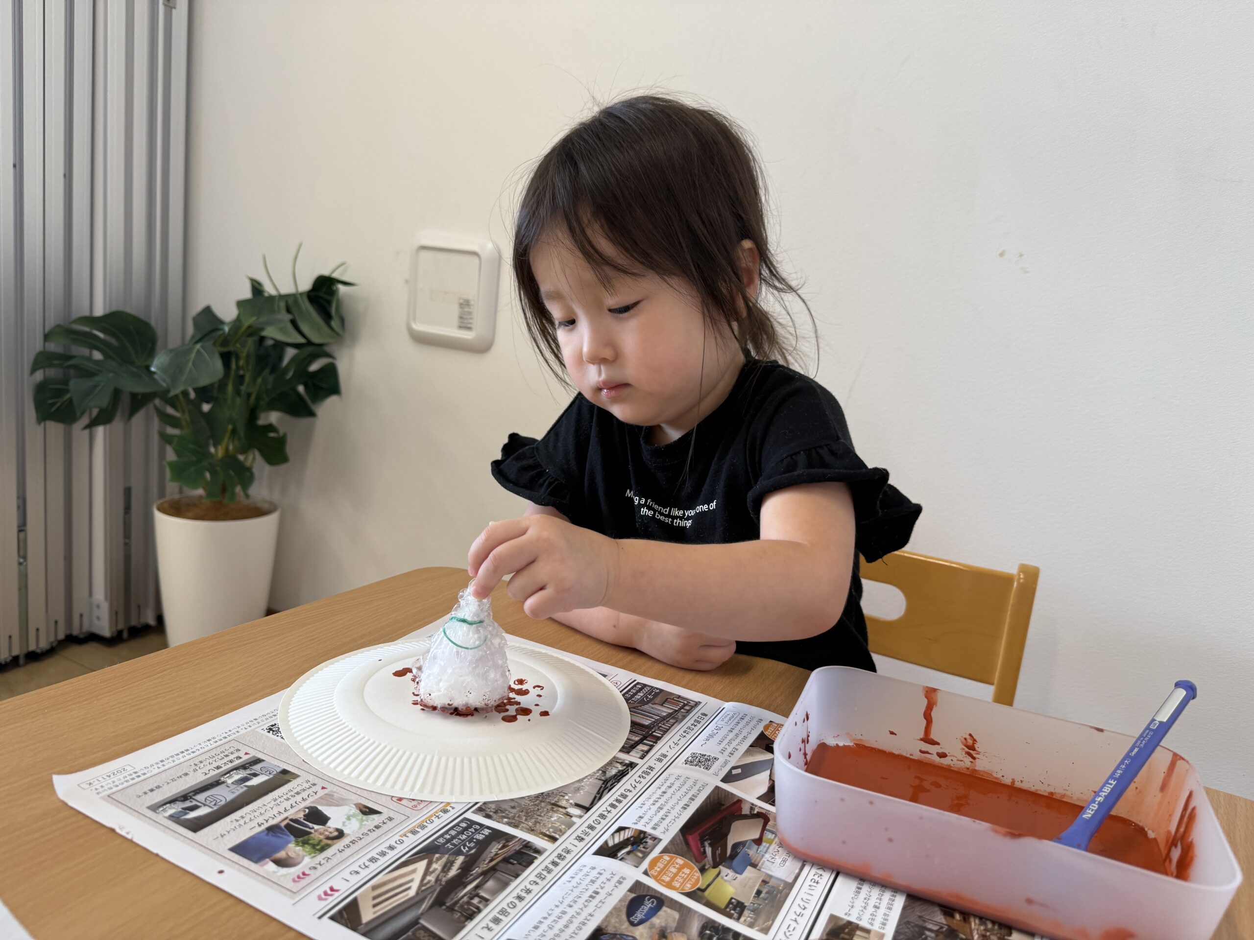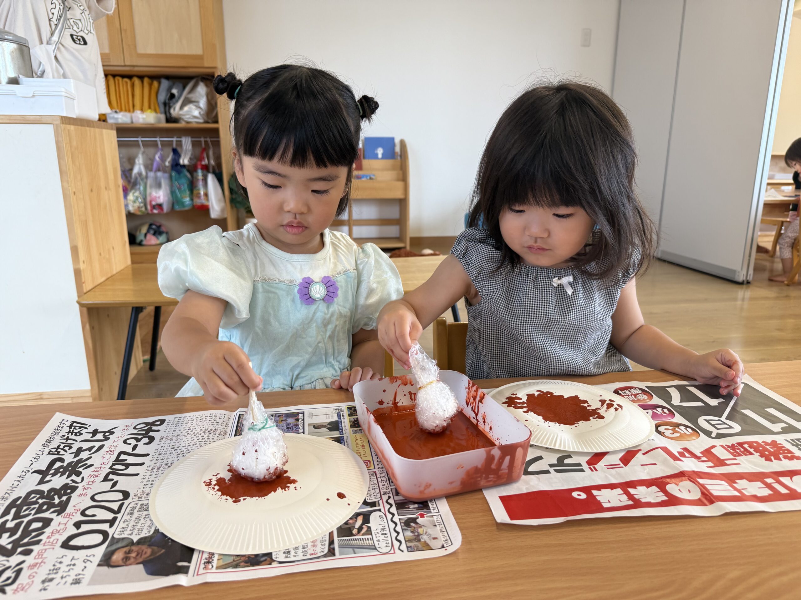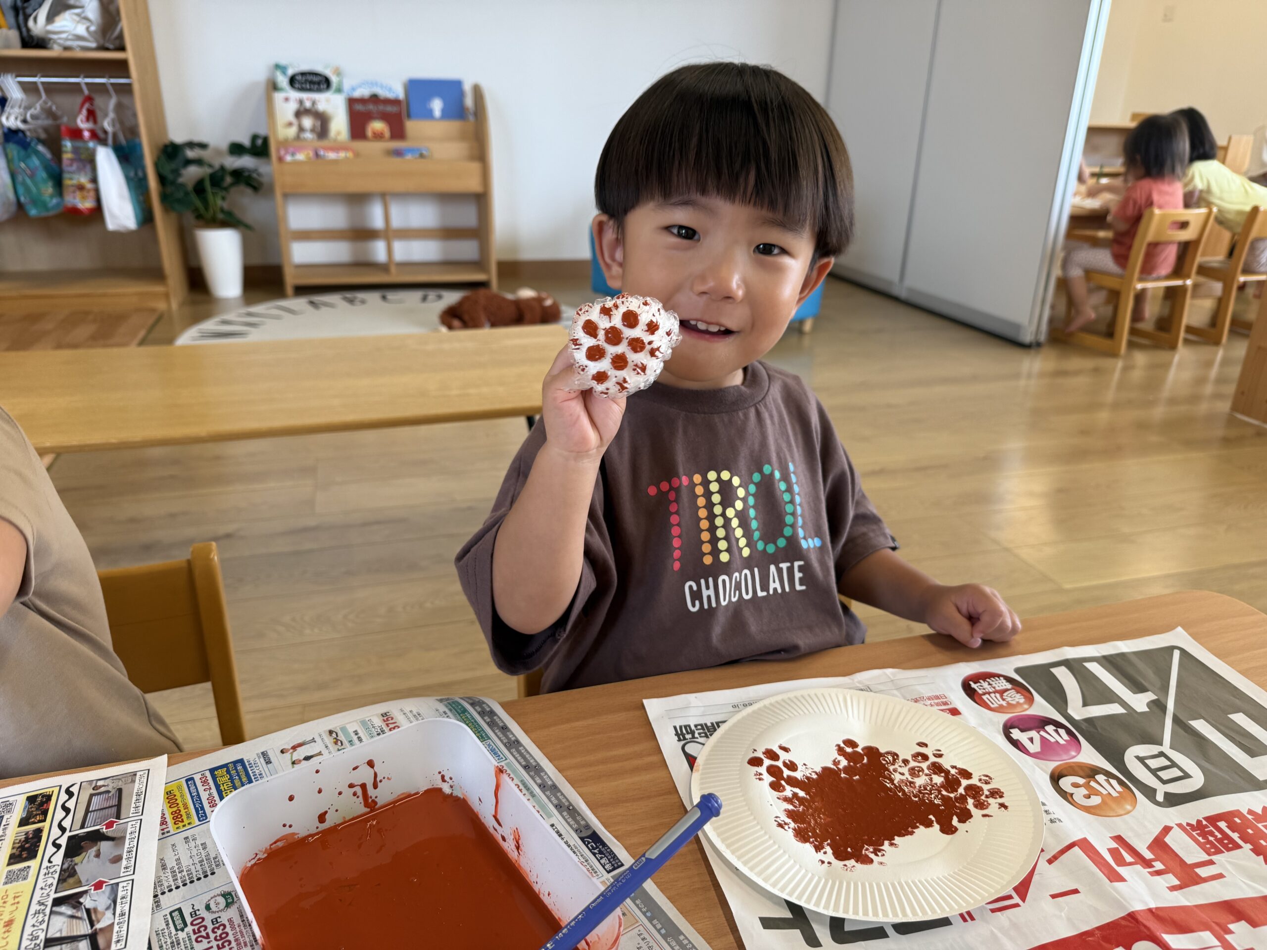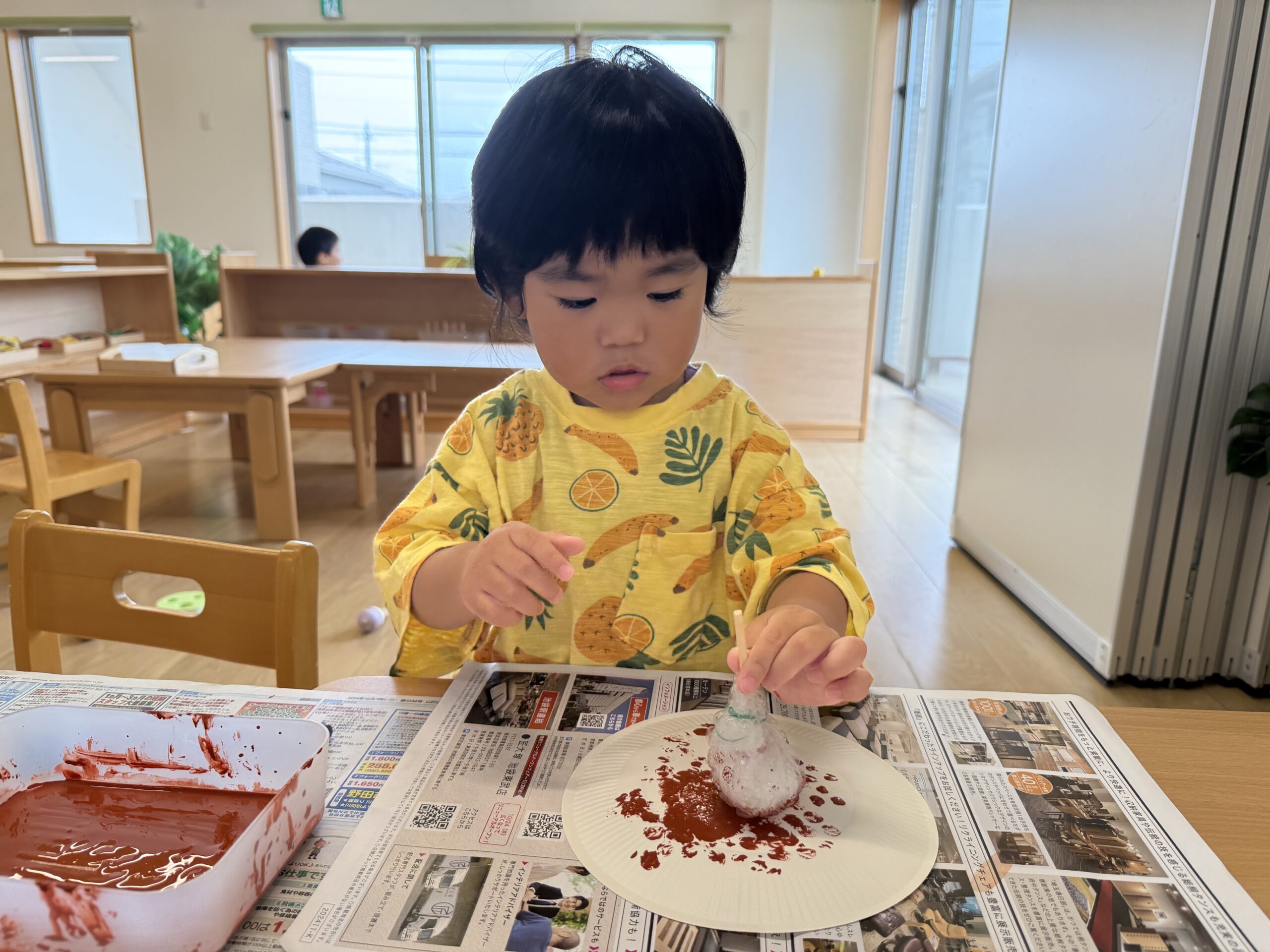 緩衝材を巻いたタンポ(布やガーゼで綿を包んだ道具)を使って茶色の絵の具をつけて紙皿にポンポンと叩くようにして模様をつけました♪