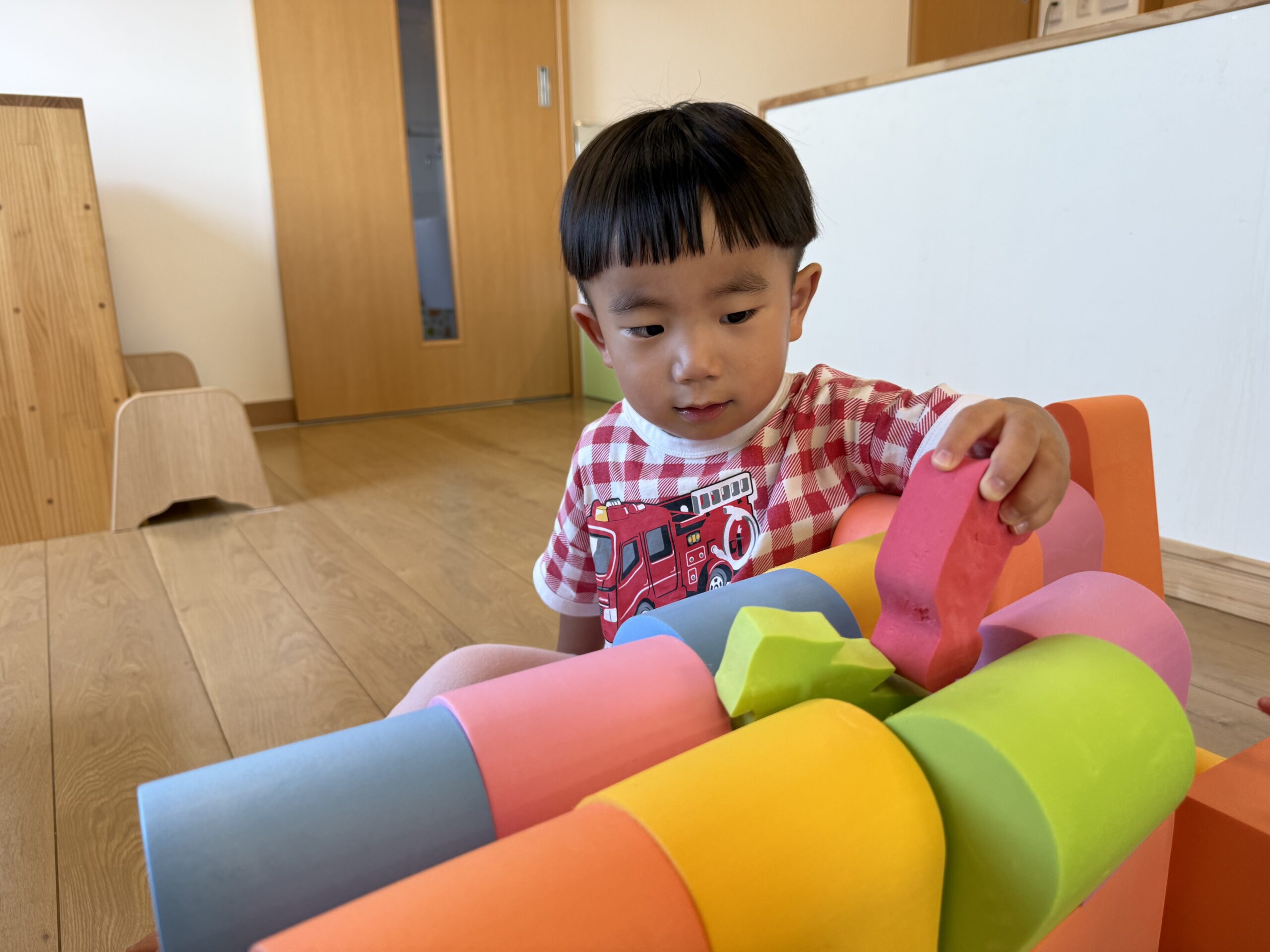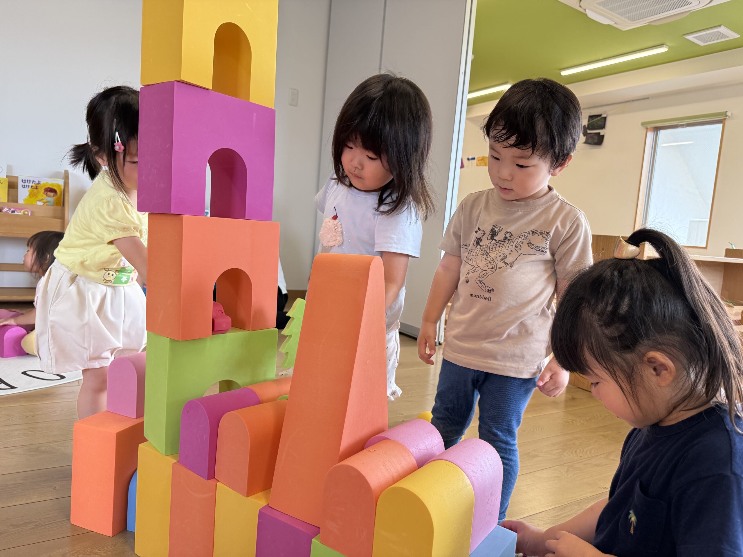 子どもたちがブロックを組み合わせて、駐車場や家、タワーなどを作って楽しんでいますよ🎶