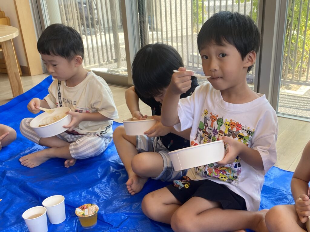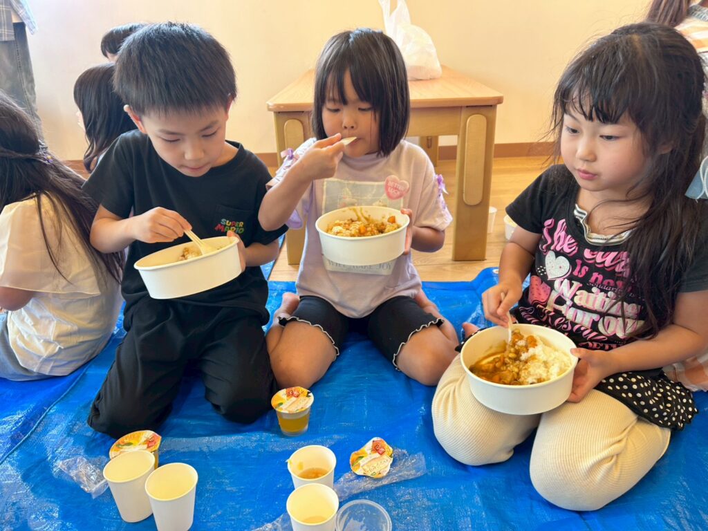 椅子に座って食べる時とは少し違う特別感があったようで、訓練という緊張感がありながらもみんなで楽しく食べていました🍛