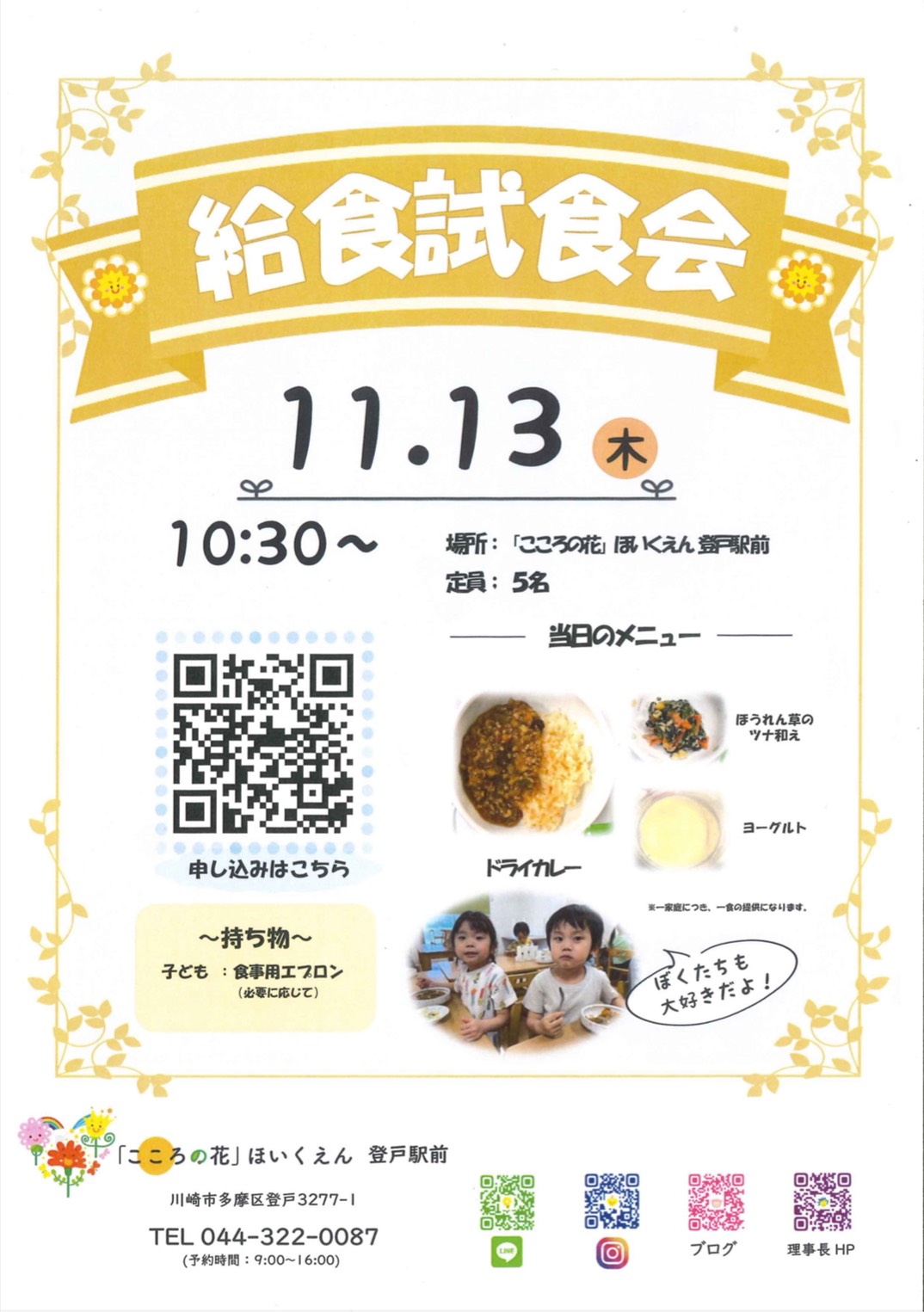 「こころの花」ほいくえん 登戸駅前では、園で提供している給食を実際に味わっていただける 「給食試食会」を開催いたします✨